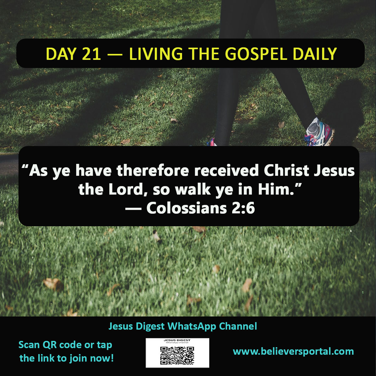 Day 21 devotional reveals how to live out the Gospel in daily life. Based on Colossians 2:6, it teaches that the same grace that saves us also sustains us, freeing us from compartmentalized faith and empowering practical, grace-filled obedience in our routines, relationships, and responsibilities.