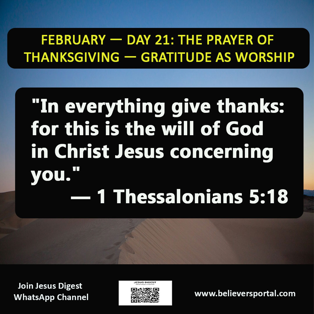 Day 21 of the February Prayer Series elevates thanksgiving from polite prelude to essential worship. Rooted in 1 Thessalonians 5:18, it reveals how gratitude shifts focus, reframes trials, guards the heart, and honors God—modeled perfectly by Jesus, who gave thanks before the miracle.