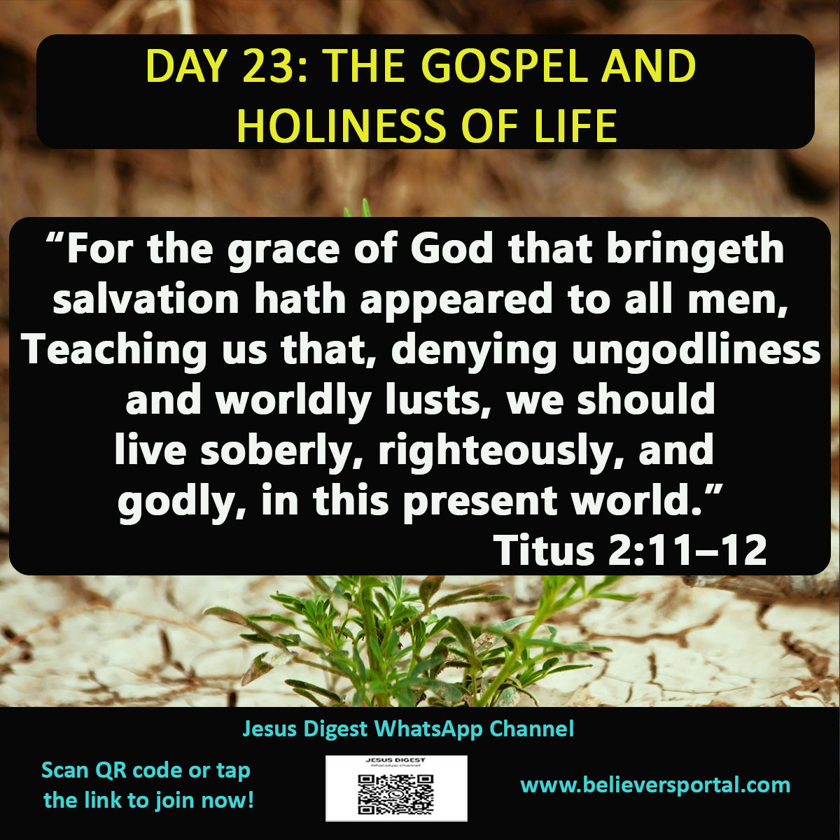 Day 23 devotional unveils the Gospel as the source of true holiness. Based on Titus 2:11-12, it explains that the grace which saves us also trains us to live godly lives, freeing us from the burden of self-effort and transforming holiness into a joyful response to God’s love and acceptance in Christ.